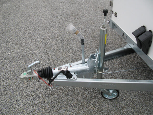 Das klappbare Automatik-Stützrad erleichtert die Handhabung, während die V-Deichsel mit Metallkotflügel für eine stabile Fahrweise sorgt. An der Vorderseite sind zwei Handgriffe integriert, die das Manövrieren erleichtern.