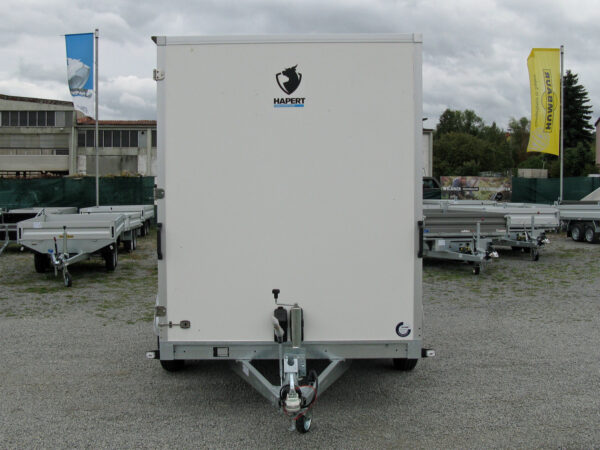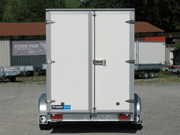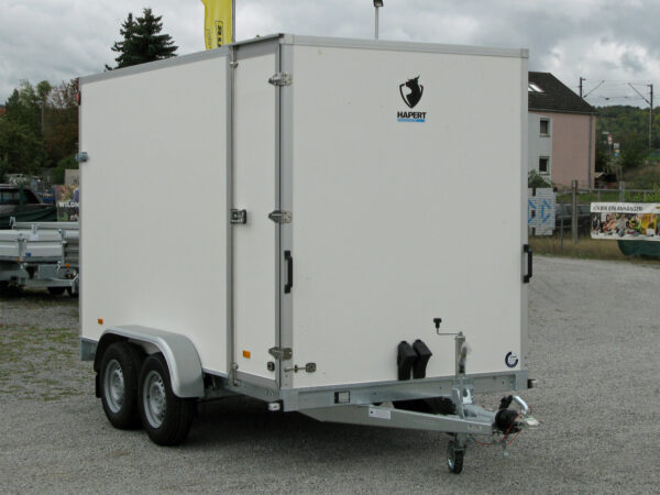 Der Hapert Sapphire L-2 – 2700 ist ein robuster Tieflader-Kofferanhänger, ausgestattet mit Türen hinten und einer Seitentüre vorne rechts für optimalen Zugang.