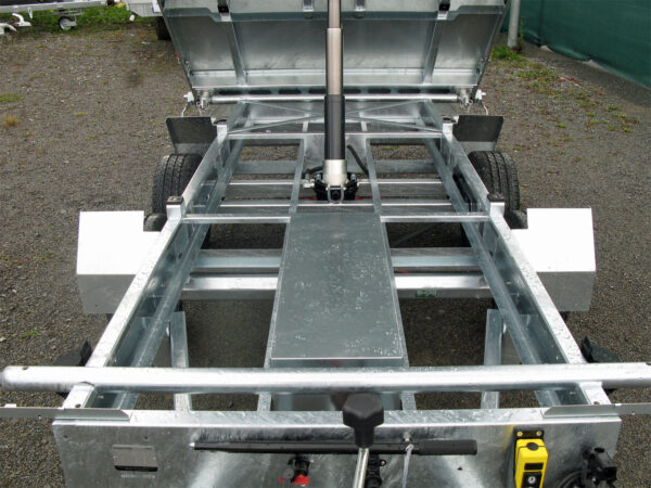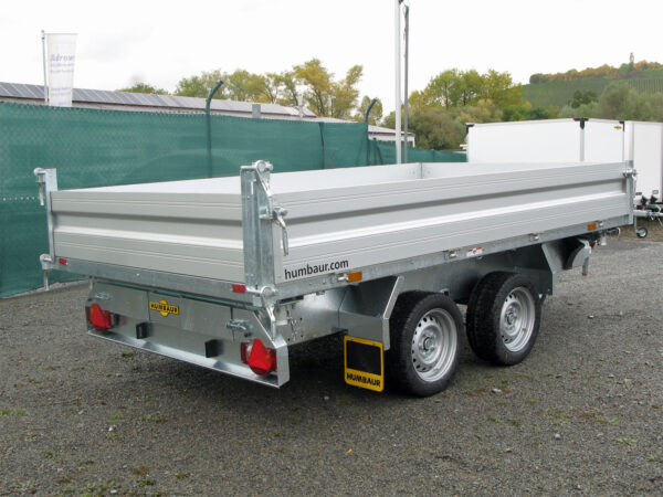 Der Humbaur HTK 3000.37 ALU ist ein robuster Dreiseitenkipper mit eloxierten Aluminium-Bordwänden und einem tauchbadverzinkten Fahrwerk für maximale Haltbarkeit. Die aus einem Stück gefertigte Stahl-Kippbrücke sorgt für eine hohe Stabilität und Langlebigkeit. Mit acht im Brückenboden montierten Anbinderingen (je 800 kg Zugkraft), einer hochwertigen Hydraulikeinheit und einem hartverchromten 4-stufigen Qualitäts-Kippzylinder bietet er eine zuverlässige Kippfunktion. Die Heckklappe ist pendelbar, und der Bohlenschacht ist vormontiert und als Vorbereitung für Alubohlen ausgelegt. Das Modell ist mit einer Elektro- und Handpumpe ausgestattet, und der Kippwinkel beträgt ca. 45° nach hinten und seitlich.