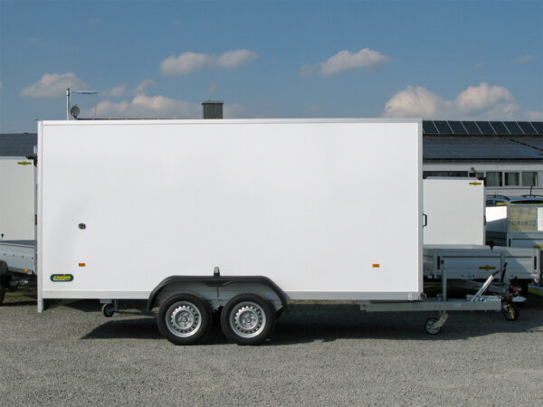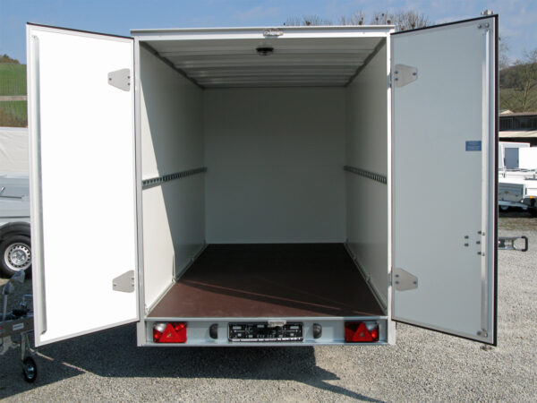 Der Unsinn UKU 421719-30-14 ist ein stabiler und vielseitiger Kofferanhänger mit einer verwundungssteifen Aluminiumfahrgestell-Konstruktion, die für sichere Fahreigenschaften sorgt. Dank der Leichtbauwände aus GFK-Stahl-Sandwich mit einer stoßfesten Stahl-Innenbeschichtung und einer beschriftungsfreundlichen GFK-Außenfläche ist er besonders strapazierfähig. Das Dach aus GFK-Sandwichplatten bietet zusätzlichen Schutz und Langlebigkeit. Die Auffahrklappe mit Gasfederhubhilfe und rutschhemmendem Bodenbelag gewährleistet eine komfortable Nutzung. Zusätzlich sorgt das integrierte Zurrsystem mit 10 verstellbaren Anbinderingen sowie die Stäbchenzurrleiste an den Seitenwänden für optimale Ladungssicherung. Die schwenkbare LED-Innenleuchte mit Bewegungsmelder und Batterien sorgt für eine effiziente Beleuchtung.